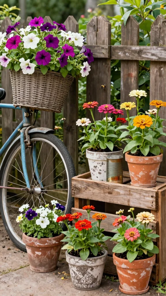 Unconventional Materials Wooden crates, vintage cans Ensure proper drainage